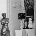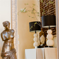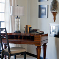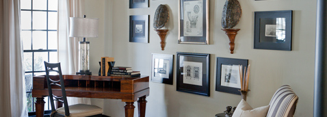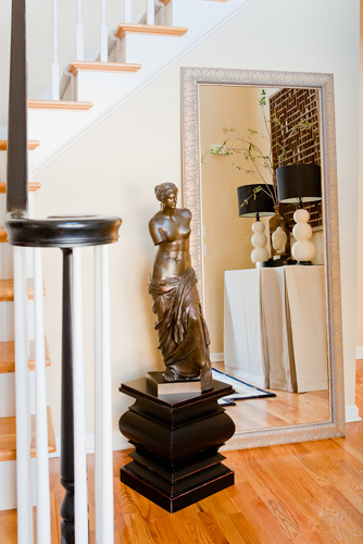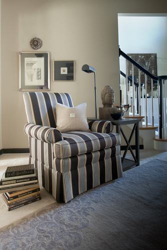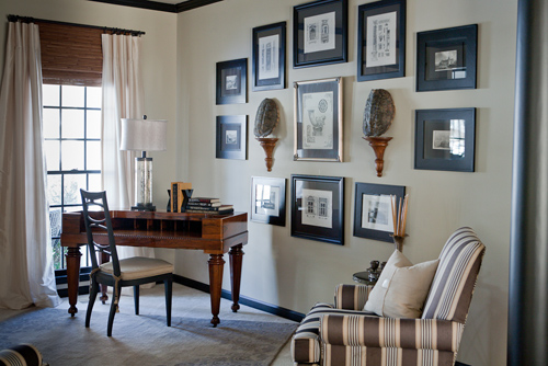 This owner loves architecture. When a home doesn’t bring you architectural details, you create your own. By painting the trim in a dark scheme this home now boasts interest. Repeating the dark features gives a feel for additional architecture. Layering with old and new helps to create a warm inviting environment. Classic black touches can be seen throughout this design.